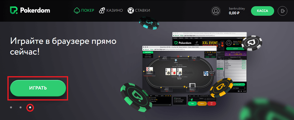 Покер-рум PokerDom предоставляет своим пользователям полноценный браузерный клиент, который оснащен максимальным набором функций и игровых возможностей. Используя чужой компьютер, игрок может играть на ресурсе заведения, не ощущая никакого дискомфорта. Главное – не пренебрегать мерами безопасности, каждый раз осуществляя разлогин и выход из аккаунта.